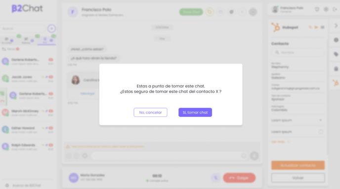 “Estás a punto de tomar este chat. ¿Estás seguro de tomar este chat del contacto X?”