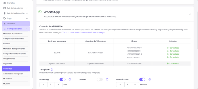 En esta sección de la plataforma podrás validar fácilmente qué números de WhatsApp están conectados correctamente a Marketing Message (MM) Lite, así como identificar a qué Business Manager y a qué Cuenta de WhatsApp pertenece cada línea.