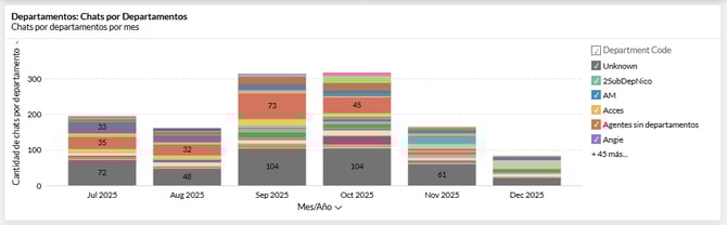 Si deslizas hacia abajo verás un tercer informe llamado: "Chats Departments " donde podrás ver en una gráfica de barras 👨🏫 que te muestra el numero de chats en cada uno de tus departamentos agrupado por meses. Debes tener en cuenta el nombre de cada departamento ha sido codificado, por eso veras, en la parte derecha de tu pantalla, las convenciones de color asociadas al código de cada departamento.