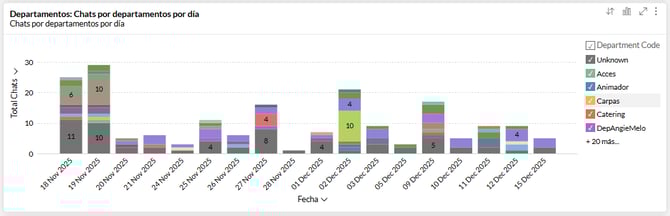 Luego veras un Informe en grafico de barras llamado: "Chats Department For Day" que te muestra el número de chats por departamento dentro de los ultimos 30 dias, esta grafica es muy útil para comprar el trafico de cada departamento día a día.
