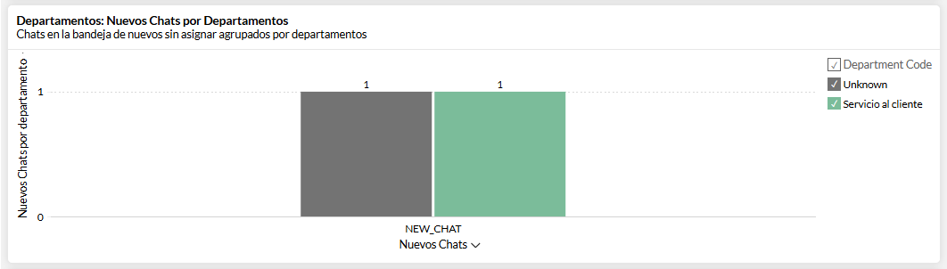 Luego veras un Informe en grafico de barras llamado: "New Chats For Department" que te muestra el número de chats por departamentos en la bandeja de nuevas.